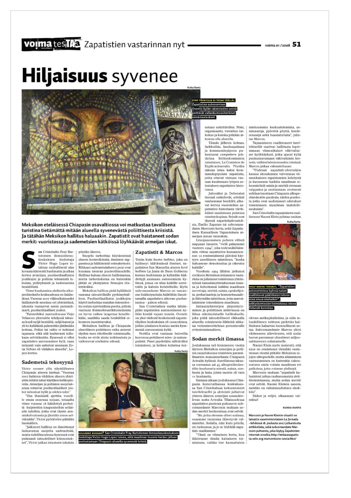 ”Vuonna 2007 väkivaltaisuudet kasvoivat monissa eri yhteisöissä ja iskut olivat erityisesti paramilitaarien tekemiä. Esimerkiksi marraskuussa Viejo Velascon yhteisöön tehdyssä iskussa kuoli 4 henkilöä, 4 katosi ja yli 60 kyläläistä pakotettiin jättämään kotinsa. Tapausta ei ole tutkittu valtion taholta, eikä sitä luultavasti tullakaan selvittämään. Kyseessä ei ollut Zapatistien autonominen kylä, vaan yksinkertaisesti nämä kyseiset intiaanit sattuivat asumaan Zona Selvan eli viidakon alueella.”