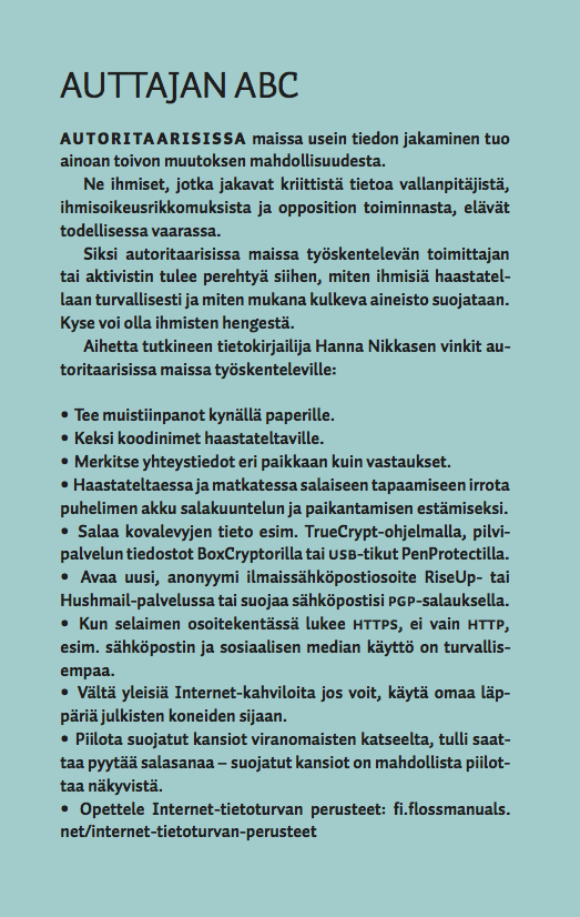 Siksi autoritaarisissa maissa työskentelevän toimittajan tai aktivistin tulee perehtyä siihen, miten ihmisiä haastatellaan turvallisesti ja miten mukana kulkeva aineisto suojataan. Kyse voi olla ihmisten hengestä.