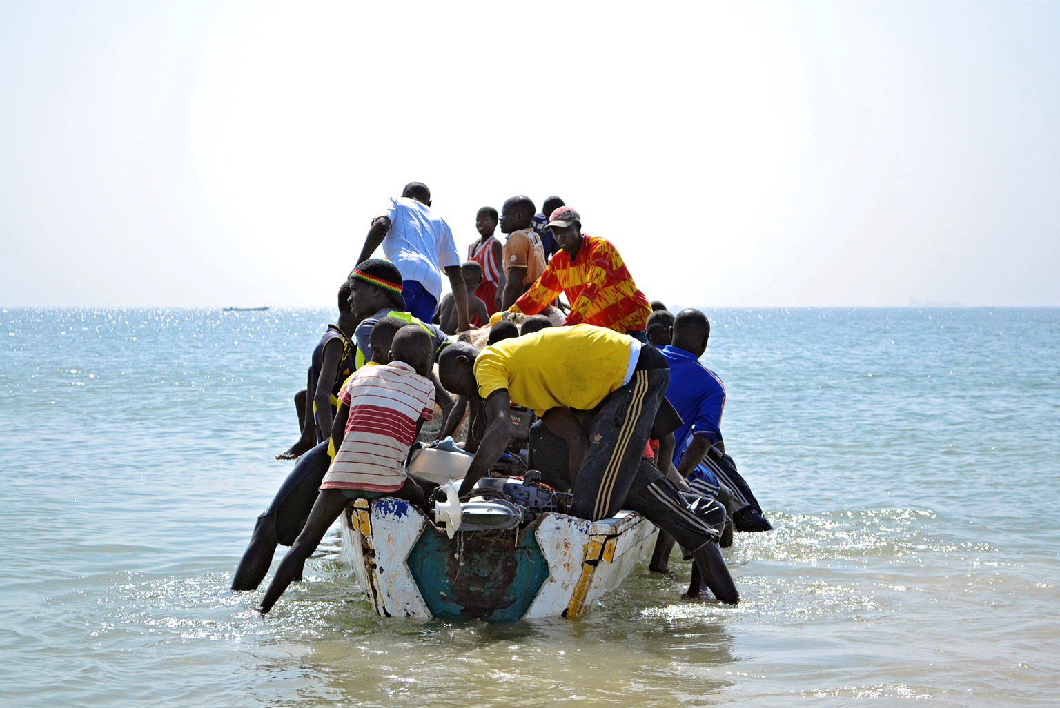 Solen har målat horisonten orangeröd vid en senegalesisk fiskarstrand. Handmålade träbåtar vilar i sanden, några förankrade båtar vaggar i strandskvalpet. Bara ett fåtal av båtarna åker numera ut på havet för att fånga fisk.
