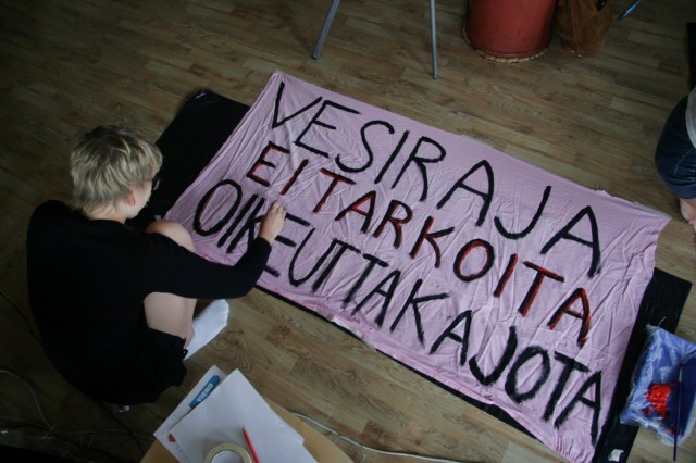 Opiskelija Heidi Räihä, 28, kastaa sormensa maalipurkkiin ja levittää punaista viivaa banderollikankaaseen. Hän on yksi Lutkamarssin järjestäjistä. Kansainvälinen feministinen marssi järjestetään Suomessa lauantaina 6. elokuuta.