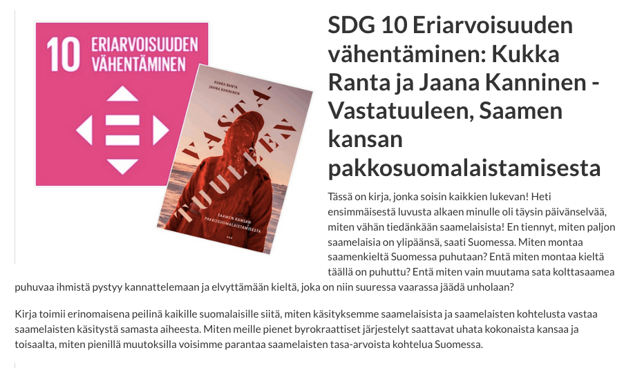 ”SDG 10 Eriarvoisuuden vähentäminen: Kukka Ranta ja Jaana Kanninen – Vastatuuleen, Saamen kansan pakkosuomalaistamisesta: Tässä on kirja, jonka soisin kaikkien lukevan! Heti ensimmäisestä luvusta alkaen minulle oli täysin päivänselvää, miten vähän tiedänkään saamelaisista! (…) Kirja toimii erinomaisena peilinä kaikille suomalaisille siitä, miten käsityksemme saamelaisista ja saamelaisten kohtelusta vastaa saamelaisten käsitystä samasta aiheesta. Miten meille pienet byrokraattiset järjestelyt saattavat uhata kokonaista kansaa ja toisaalta, miten pienillä muutoksilla voisimme parantaa saamelaisten tasa-arvoista kohtelua Suomessa.”